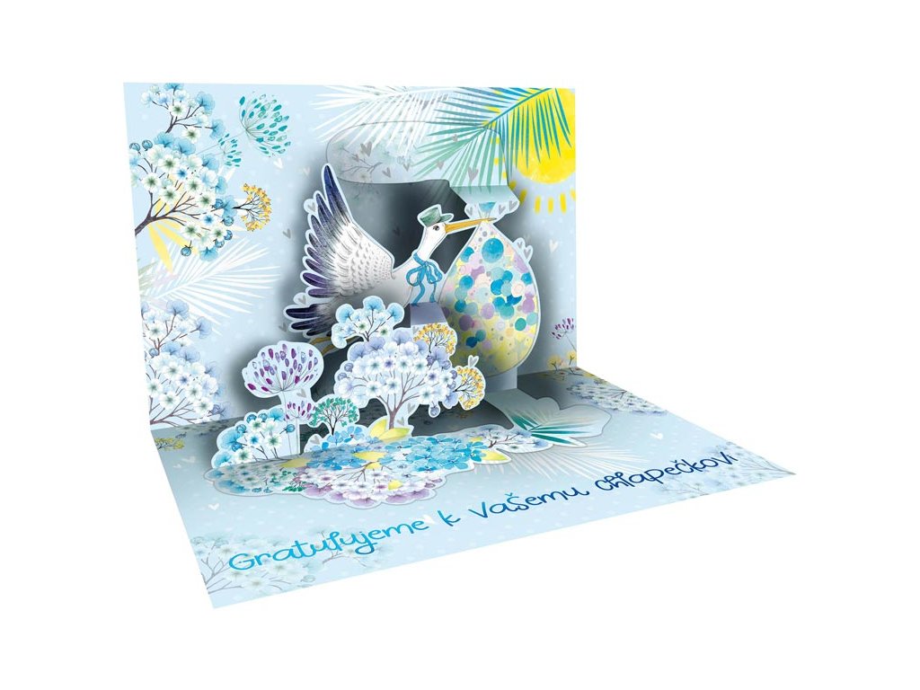 Blahopřání k narození chlapečka. Při otevření přání se zobrazí 3D obrázek. Včetně modré obálky.