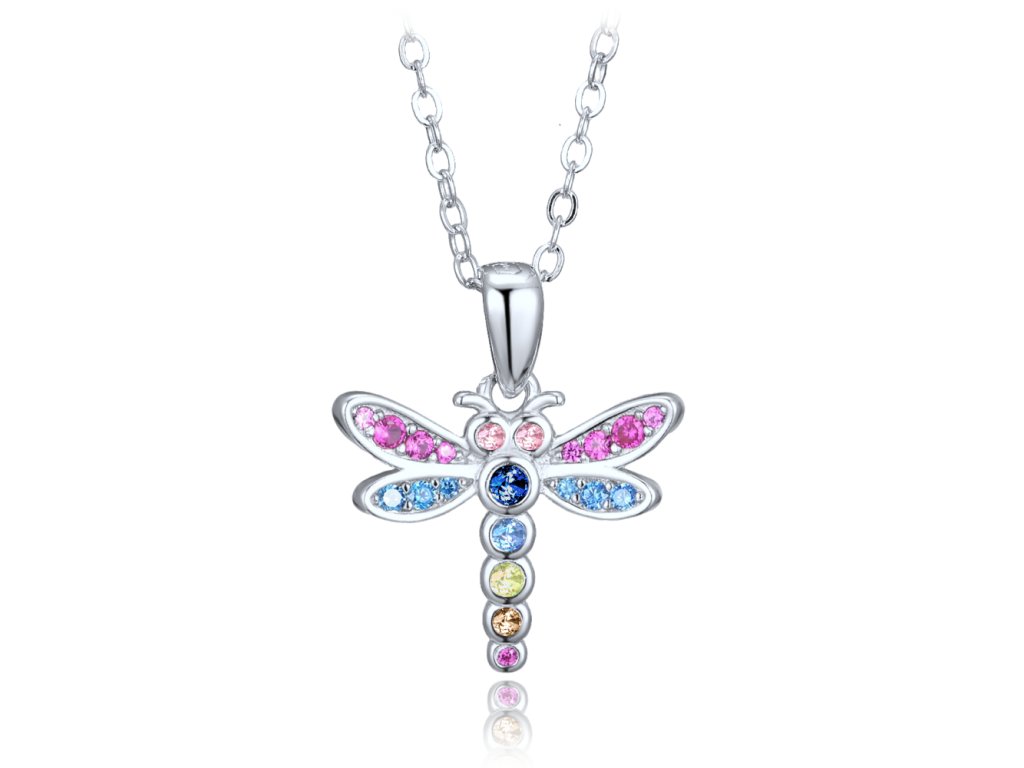 Stříbrný dětský náhrdelník s vážkou zdobenou barevnými zirkony. Náhrdelník má rhodiovou úpravu, která zajišťuje stříbru stejné vlastnosti jako u bílého zlata – odolává oxidaci a nečerná. K náhrdelníku můžete přikoupit i náušnice s barevnou vážkou.
