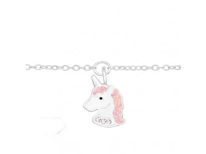 Dětský stříbrný přívěsek - hlava jednorožce s růžovou hřívou se třpytkami, na krku má tři čiré kamínky.