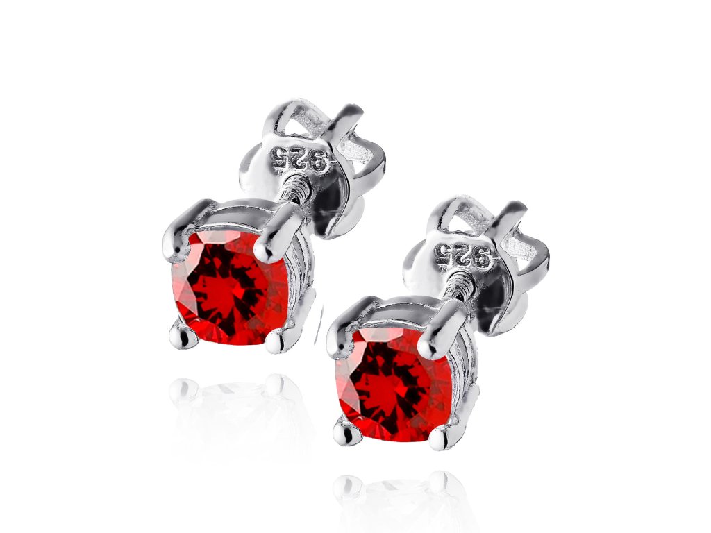 Stříbrné náušnice s červeným zirkonem. Náušnice jsou povrchově upraveny rhodiem pro zajištění perfektního vzhledu a hypoalergenních vlastností. Bezpečné zapínání na šroubek.