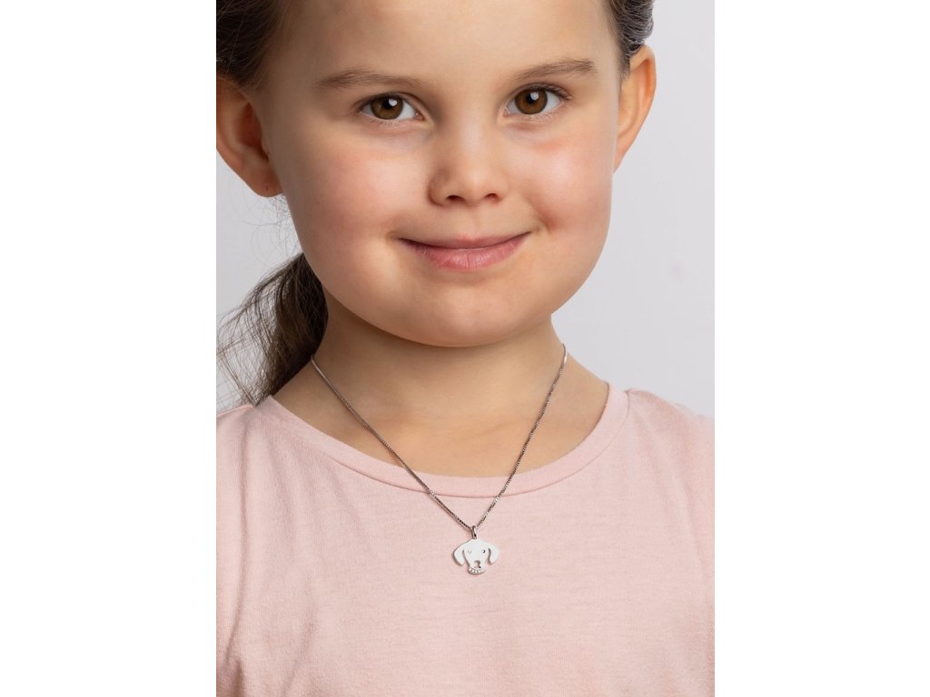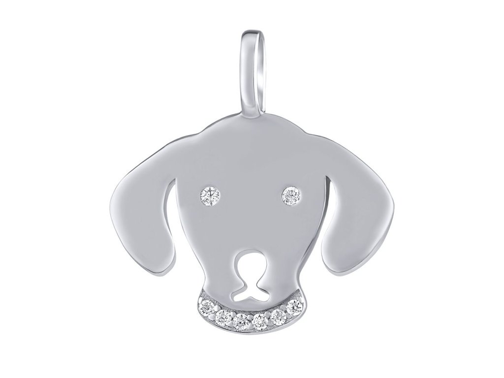 Stříbrný přívěsek - pejsek se zářícíma očima tvořenými čirými zirkony a s krásným třpytivým obojkem se zirkony.