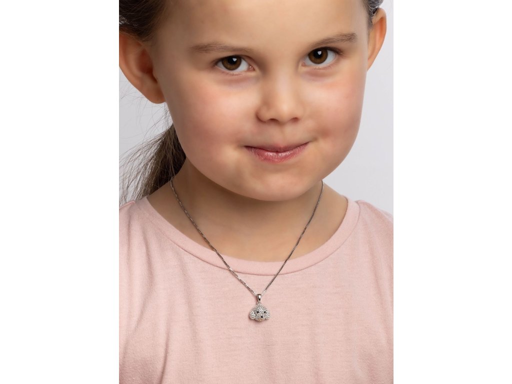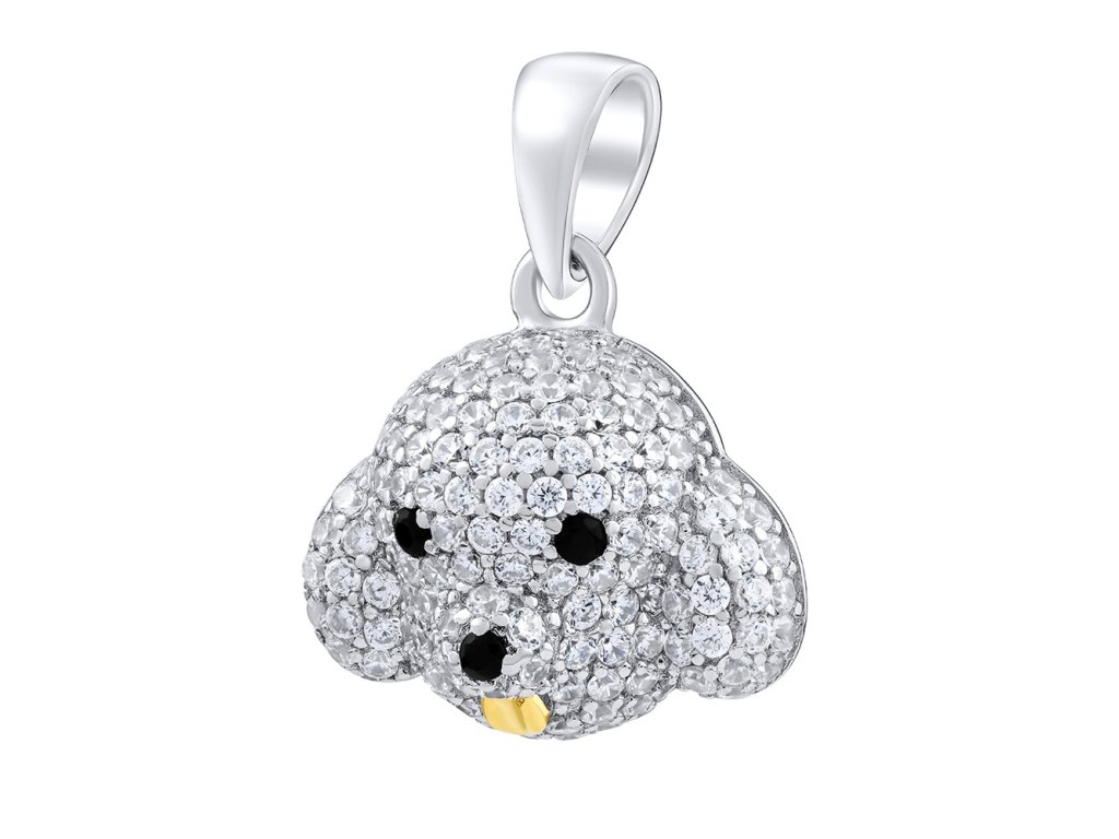 Stříbrný přívěsek - hlava pejska zdobená drobnými čirými zirkony. Oči a čumáček tvoří černé zirkony.
