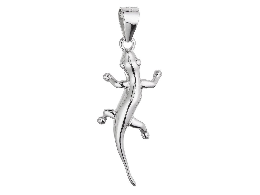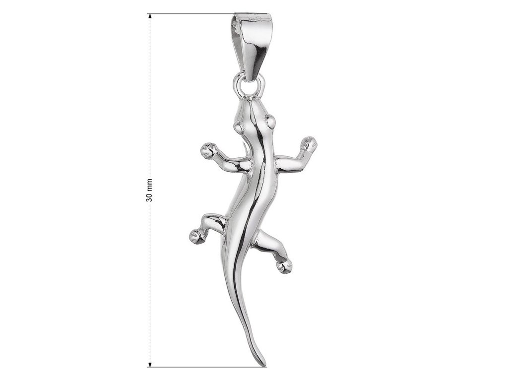 Stříbrný přívěsek - ještěrka. Přívěsek je s rhodiovou úpravou, která zajišťuje stříbru stejné vlastnosti jako u bílého zlata – odolává oxidaci a nečerná.