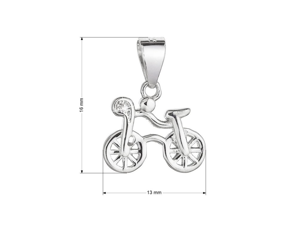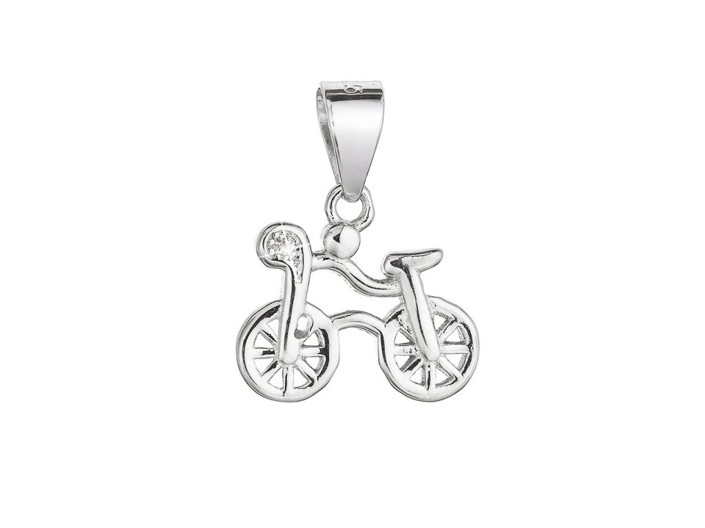 Stříbrný přívěsek - jízdní kolo s čirým zirkonem. Přívěsek je s rhodiovou úpravou, která zajišťuje stříbru stejné vlastnosti jako u bílého zlata – odolává oxidaci a nečerná.