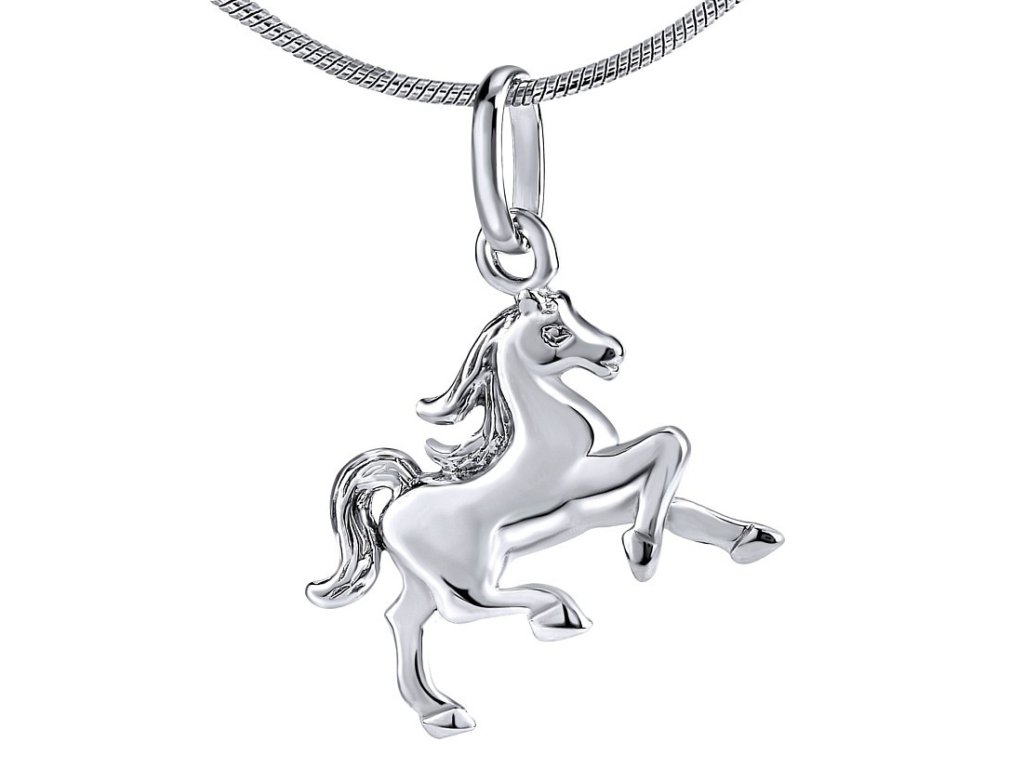 Stříbrný přívěsek - kůň. Přívěsek je s rhodiovou úpravou, která zajišťuje stříbru stejné vlastnosti jako u bílého zlata – odolává oxidaci a nečerná.