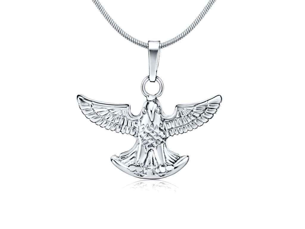 Stříbrný přívěsek - orel. Přívěsek je s rhodiovou úpravou, která zajišťuje stříbru stejné vlastnosti jako u bílého zlata – odolává oxidaci a nečerná.