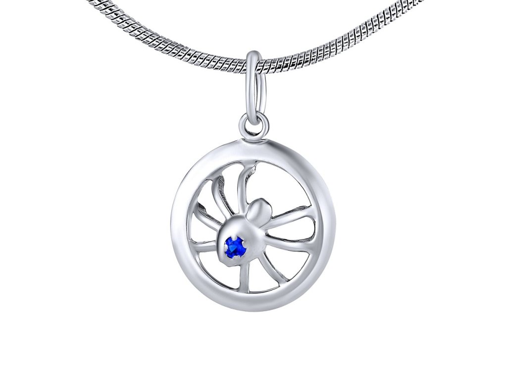 Stříbrný přívěsek - pavouček pro štěstí. Pavouček uprostřed kroužku je ozdobený modrým kamínkem ve tvaru křížku.