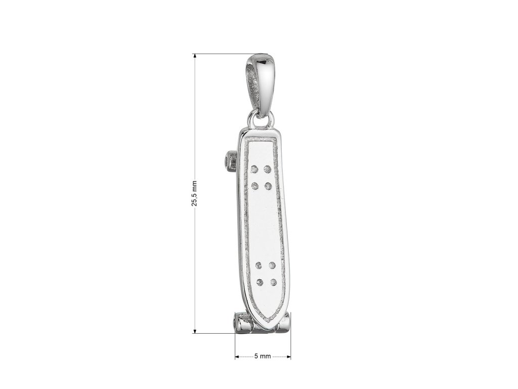 Stříbrný přívěsek - skateboard. Přívěsek má rhodiovou úpravu, která zajišťuje stříbru stejné vlastnosti jako u bílého zlata – odolává oxidaci a nečerná.